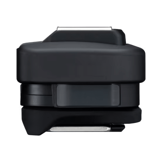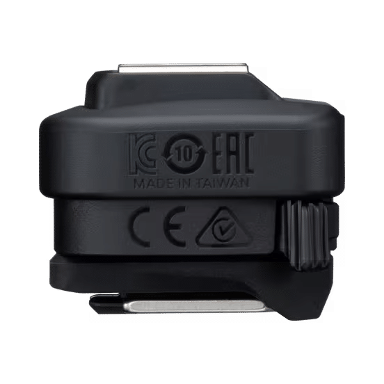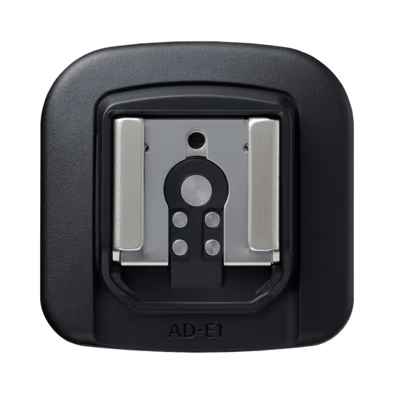 Adaptador de zapata multifunción Canon AD-E1 diseñado para conectar Speedlites con zapata convencional de 5 pines a cámaras Canon EOS R con zapata multifunción. Este adaptador mantiene la resistencia al polvo y salpicaduras conforme al estándar JIS 2, permitiendo el uso de Speedlites clásicos con las cámaras Canon más modernas.