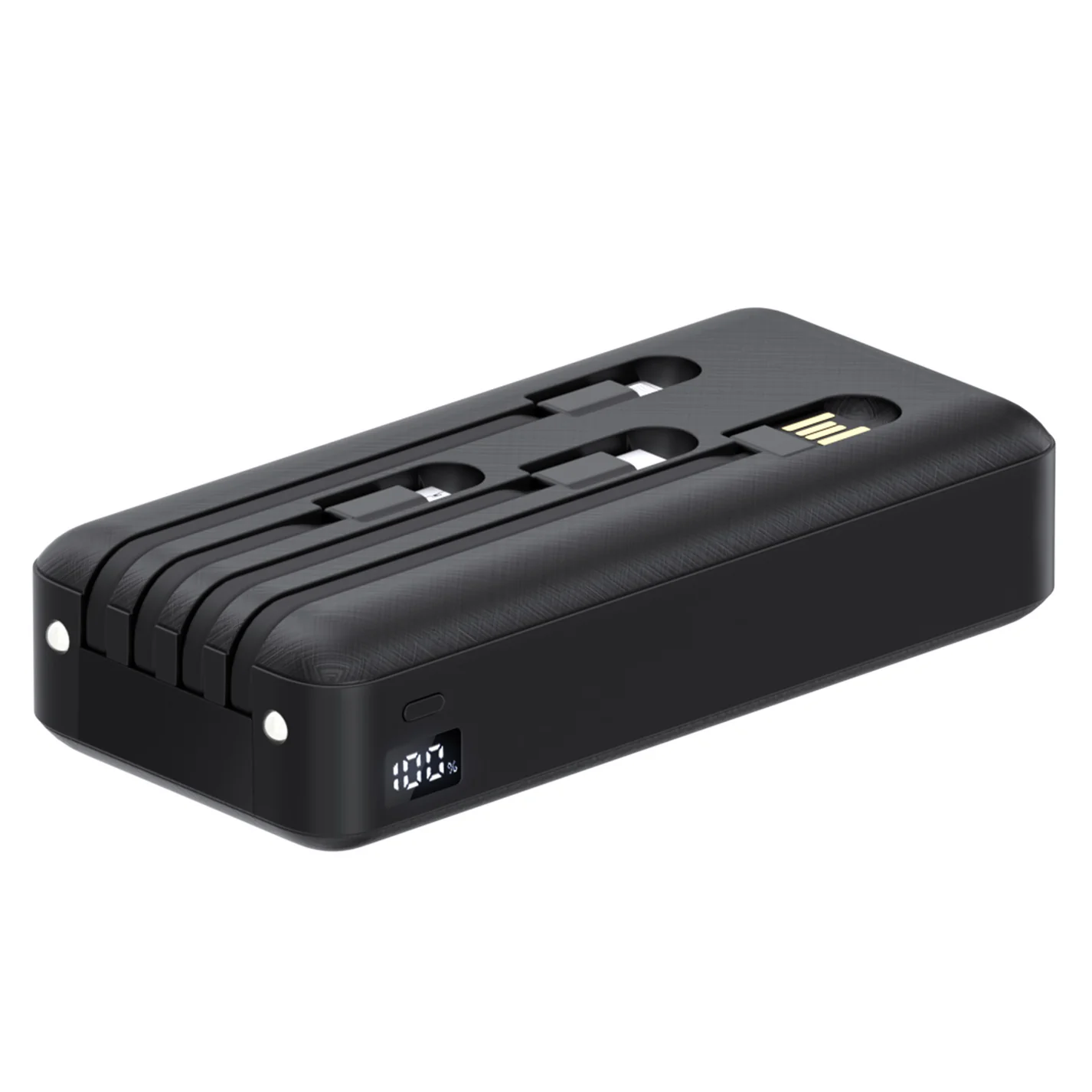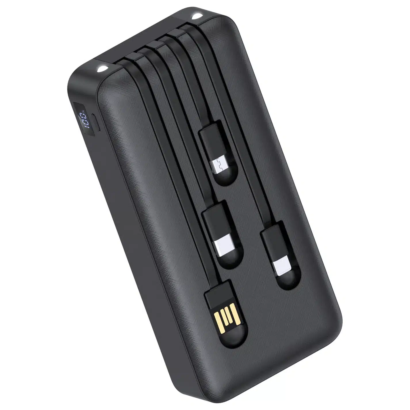 Esta batería externa todo en uno cuenta con cables Micro USB, Lightning y Tipo C integrados para carga directa, admite la autocarga por USB y es compatible con la mayoría de dispositivos. Incluye linterna LED dual y protección inteligente contra cortocircuitos, sobrecorriente y sobrecalentamiento.