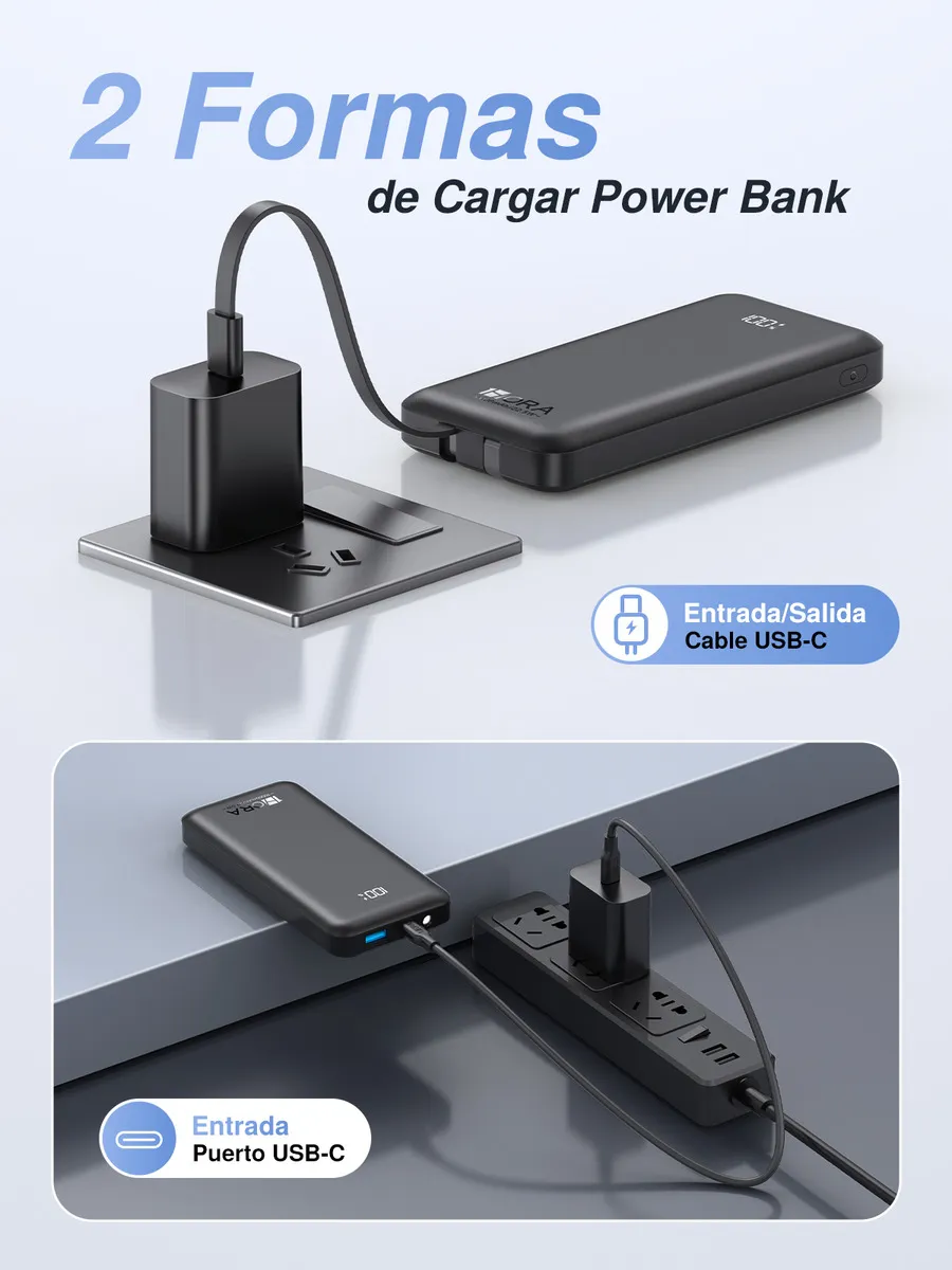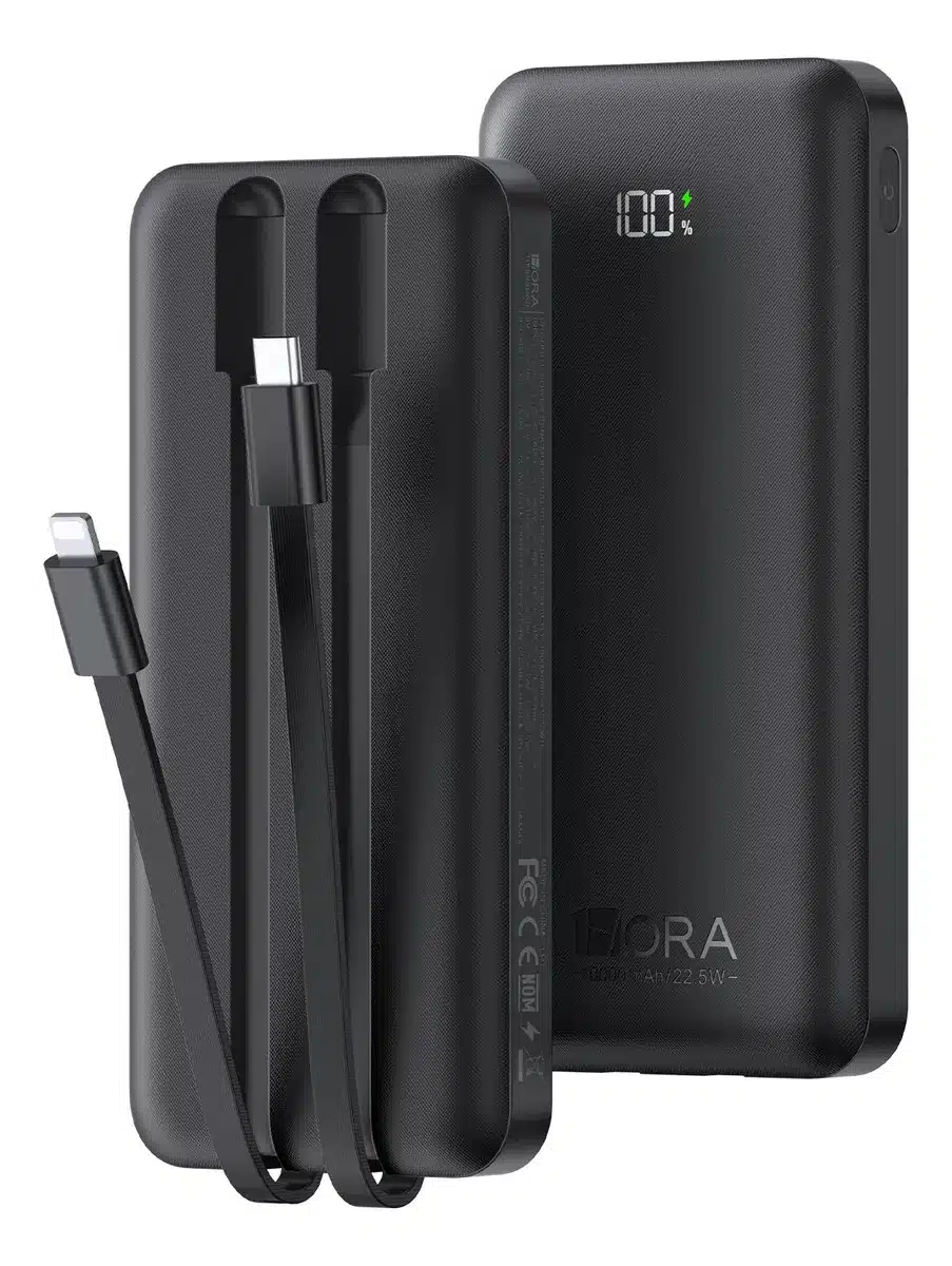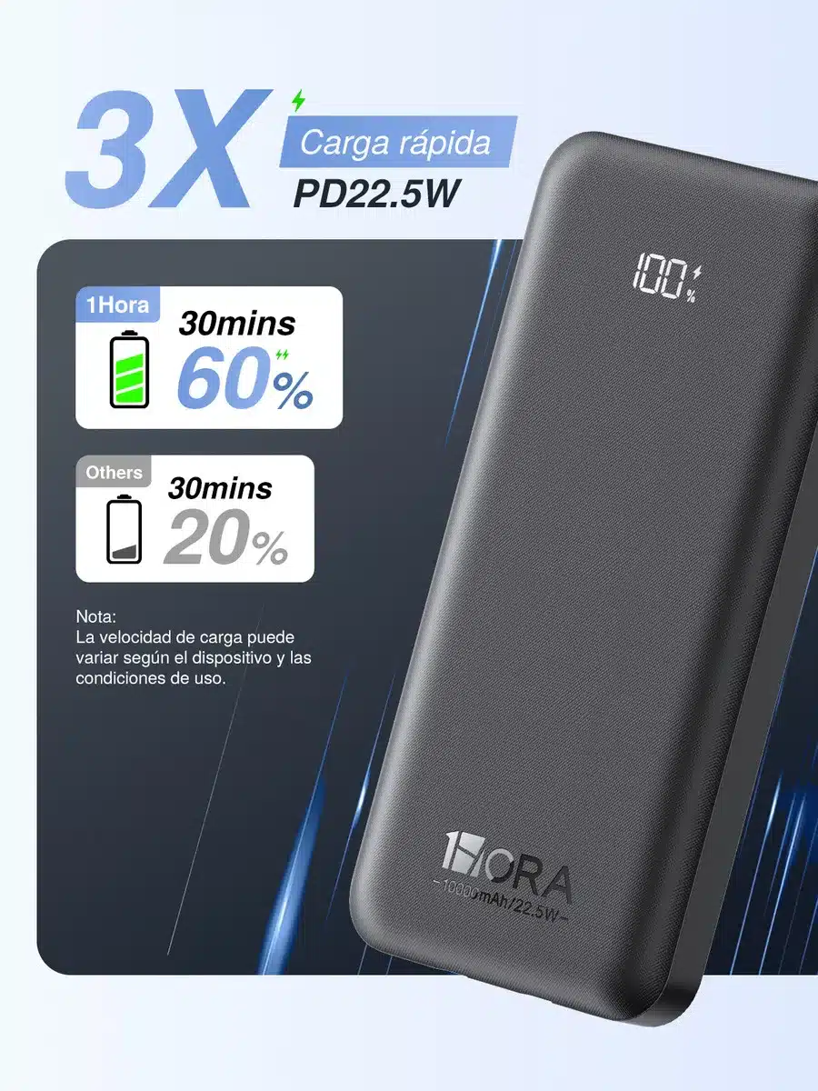 Batería portátil (powerbank) 1HORA modelo GAR264 en color negro, pensada para que mantengas tus dispositivos con energía durante el día cuando estás fuera de casa, en la oficina o de viaje. Su capacidad de 10.000 mAh te da respaldo para varias recargas parciales (según el modelo de tu teléfono y el uso), y su carga rápida de hasta 22,5 W ayuda a reducir el tiempo de carga en equipos compatibles. Integra una pantalla LED para ver el nivel de batería de manera clara y una linterna incorporada para emergencias o lugares con poca luz. En algunas fichas de venta se indica que cuenta con puerto Tipo‑C y USB‑A, y que incluye un cable Tipo‑C corto, lo que la hace práctica para llevar en bolso o morral.