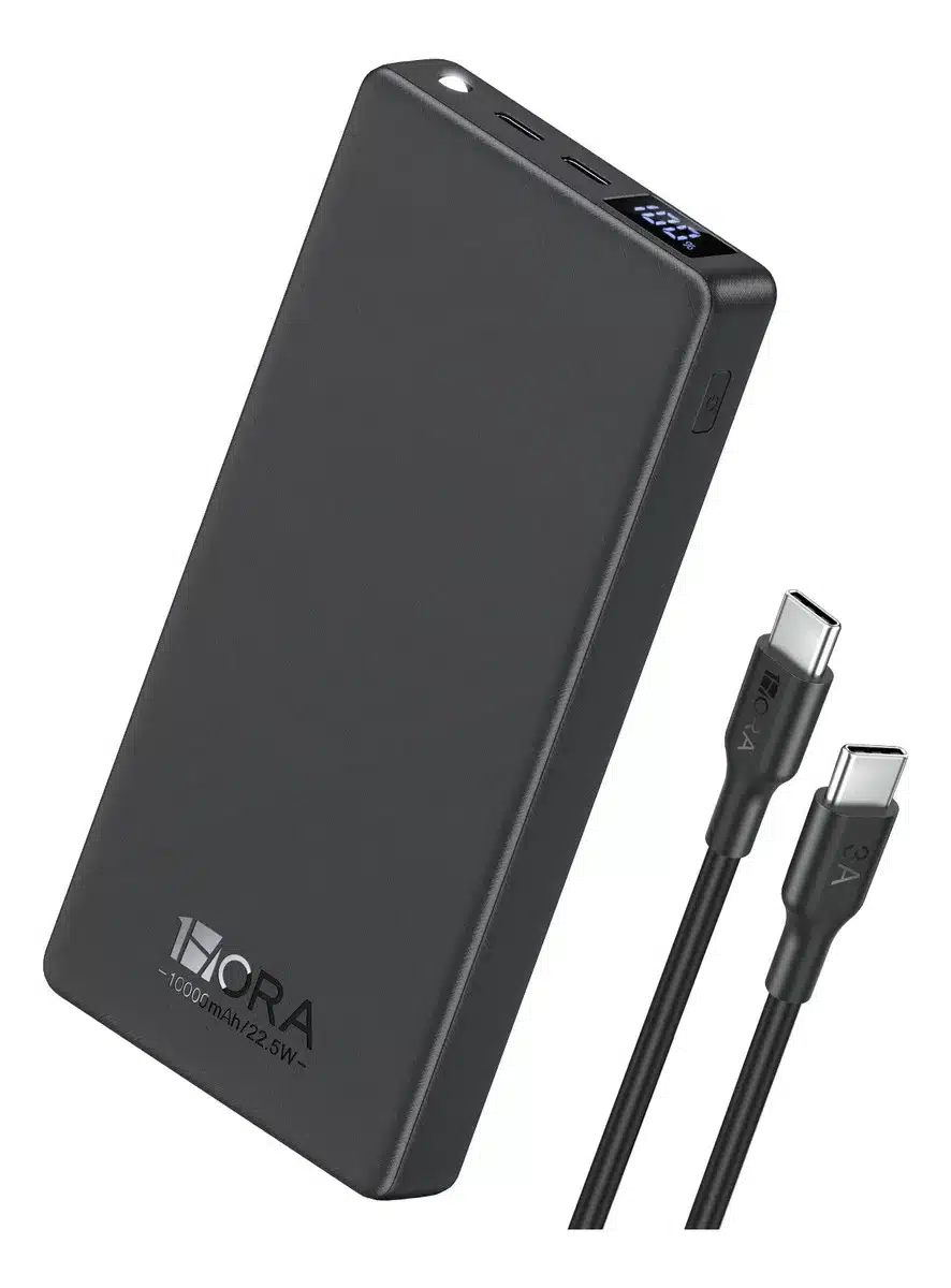 Batería portátil (powerbank) 1HORA color negro, referencia GAR264, pensada para recargar tus dispositivos cuando no tienes un tomacorriente cerca. Su capacidad de 10.000 mAh la hace adecuada para el uso diario, como recargas durante el trabajo, estudio, viajes o trayectos. Incorpora carga rápida de hasta 22,5 W para reducir tiempos de espera en dispositivos compatibles y facilitar recargas más eficientes.